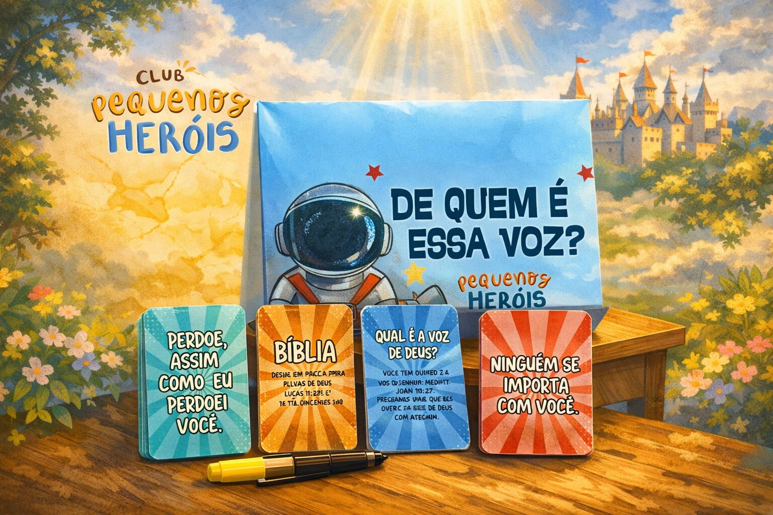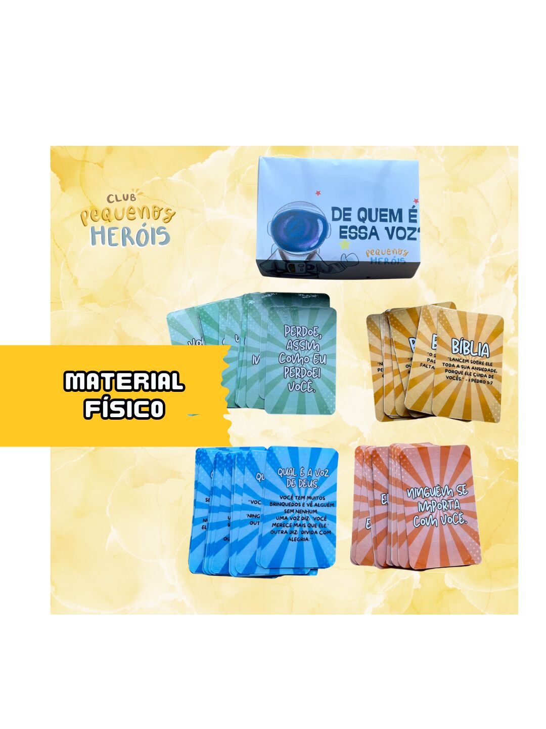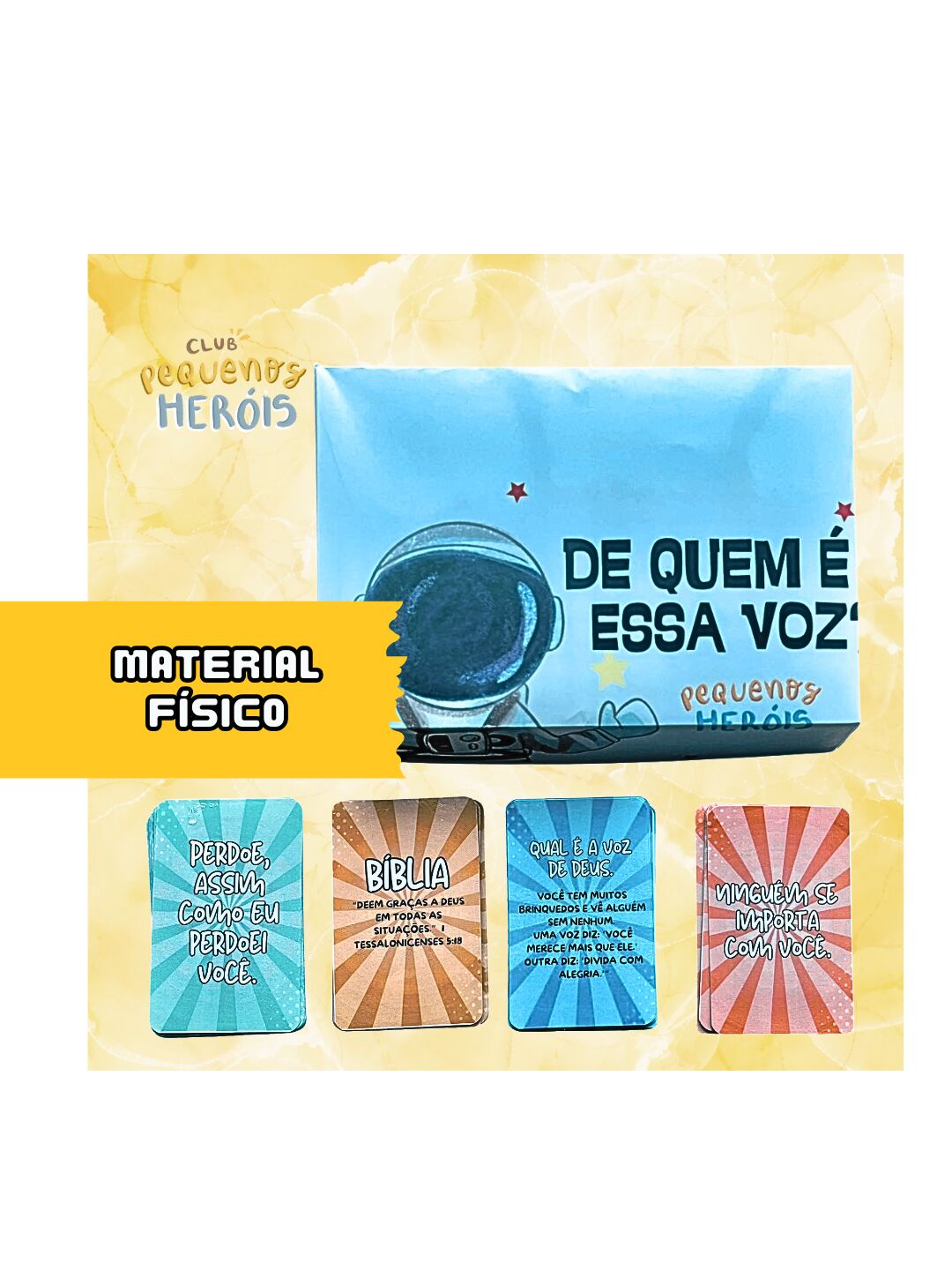 O jogo “De Quem é a Voz?” é um jogo de cartas que estimula o raciocínio, a memória bíblica e o aprendizado de forma leve e divertida! Cada carta traz uma frase marcante e algumas dicas para ajudar o jogador a descobrir quem disse aquela frase na Bíblia.